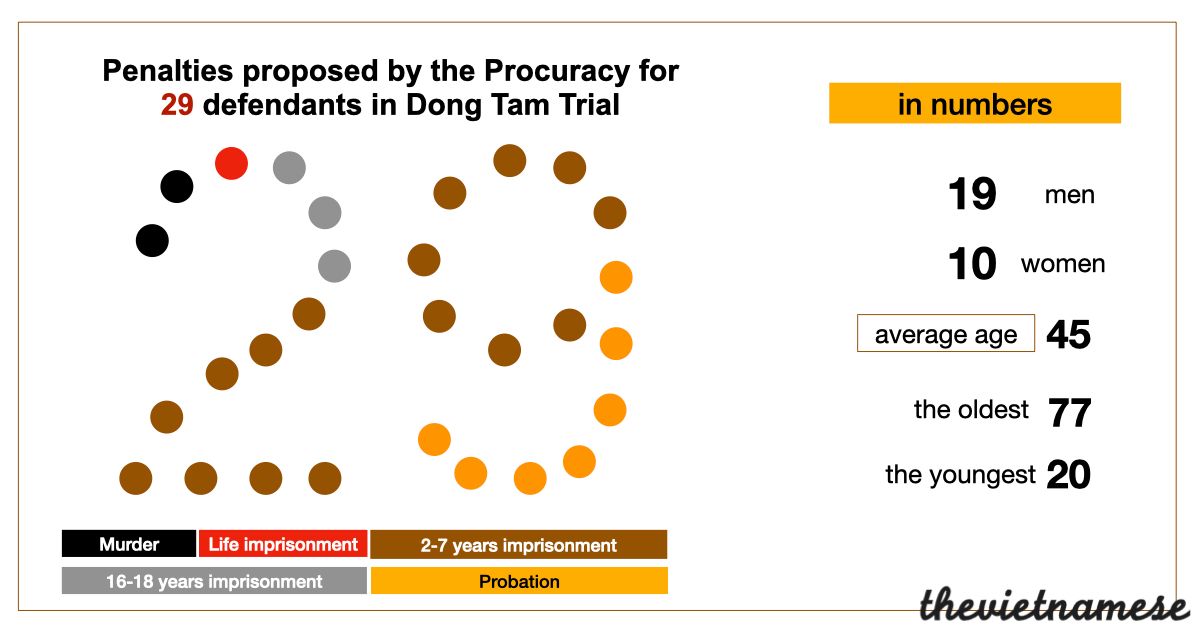 Tuoi Tre also reported that defendant Mai Thi Phan took part in the years-long protest because “Le Dinh Kinh (the head of Dong Tam Village who was killed in the incident) had promised to give a piece of the disputed land to her and the people involved.” The paper depicted the defendant as “shamefully stuttering” while admitting “We know what we did was wrong, we see our guilt now.”
